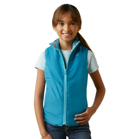 The Ariat Youth Bella Reversable Vest is lightly insulated to keep the riders core warm while riding. The vest is designed to be easily reversible with a choice between a horse themed pattern or a solid colour.