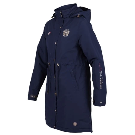 The Aubrion Ladies Team Waterproof Coat does a great job of keeping you warm and dry with style, making it great for riding or leisure. The mid thigh length and generous hood offer good coverage when the weather turns. The Aubrion Ladies Team Waterproof Coat has a waterproof outer that is breathable and has taped seams and zipper storm flap to help prevent water seepage. The embossed taffeta lining has a smart feel, the insulating polyfill keeps you warm without bulk. Easy to wear in the saddle thanks to a two way front zip and rear popper opening vents.