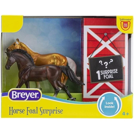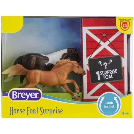 Breyer Stablemates Horse Foal Surprise will allow you to open the door to reveal the mystery foal surprise! This three piece Stablemates set comes with a stallion, mare, and a mystery foal, whose colour is a surprise! These sets feature a mare in one colour and a stallion in another, and their foal remains hidden in its stall until you open the package! Which pair of horses will you receive? A fun visual lesson in horse genetics, as the foals coat colour and pattern will be based upon the coat colour and patterns of its parents.