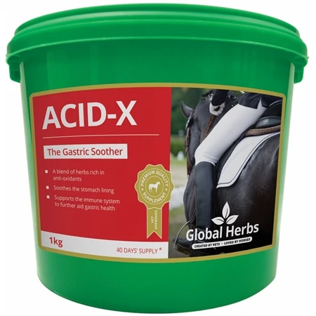 Global Herbs Acid-X is a premium gastric soothing formula. This unique blend of high-quality herbs help to maintain normal acid levels and stomach function. Acid-X helps to maintain a stable stomach lining and assists with food utilisation which allows horses to take in food more comfortably and safely. Can be used all year round for ongoing support. If you suspect your horse has colic always contact your vet.