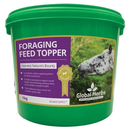 The Global Herbs Foraging Feed Topper is a traditional way to enrich the modern equine diet, delivering the natural nutrients your horse instinctively seeks. An appetising blend of premium quality naturally foraged herbs and berries, containing essential nutrients to support overall health and wellbeing. The Global Herbs Foraging Feed Topper is designed to support the immune system, healthy digestion, enhance skin and coat condition and joint health.