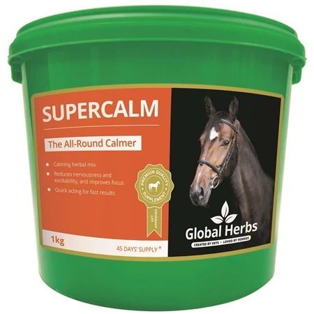 Global Herbs SuperCalm 500g Tub provides a fast, complete and natural approach to calming. This specially formulated mix helps to calm worry and nervousness in any form and promotes relaxed, good behavior. SuperCalm is a natural antioxidant and helps to support the immune system and digestion. Ideal for competing, separation worry or any other situation that your horse finds stressful. SuperCalm is suitable for long or short term use. Results can often be seen within two to three days. Suitable for all horses and ponies.