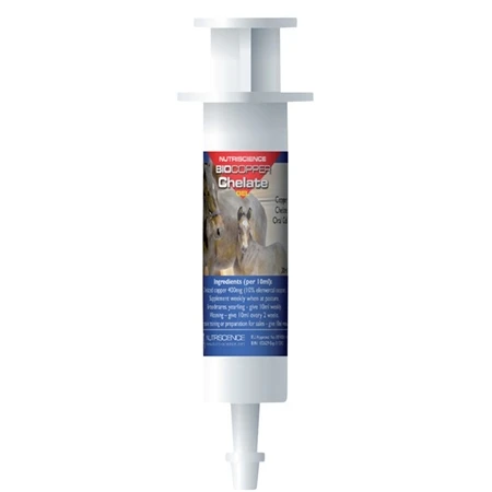 The NutriScience Bio-Copper Chelate helps to improve absorbtion of copper across the gut of the horse. Copper is important for cartilage formation and maturation in young horses. If the horse suffers from a Copper deficiency or imbalance, this can lead to abnormal cartilage formation which can lead to joint surface deterioration in the future. NutriScience Bio-Copper Chelate contains an adequate dose of the trace mineral copper to help keep your horse in the best condition.