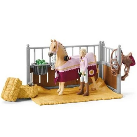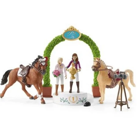 - Content: 1x stand, 1x horse box, 2x girls, 1x Trakehner mare, 1x Arabian mare, 1x mouse, 4x fences, 2x bridles with reins, 2x saddles, 1x moat, 2x flags, 1x boxwood tub with boxwood arch, 2x straw bales, 1x winner’s podium, 1x heart upright jump, 1x gold upright jump, 1x camera with tripod, 1x rubber duck, 1x apple, 1x bouquet of flowers, 1x grooming brush, 1x hoof pick, 2x helmet, 2 champion’s ribbons, 2x arm bands