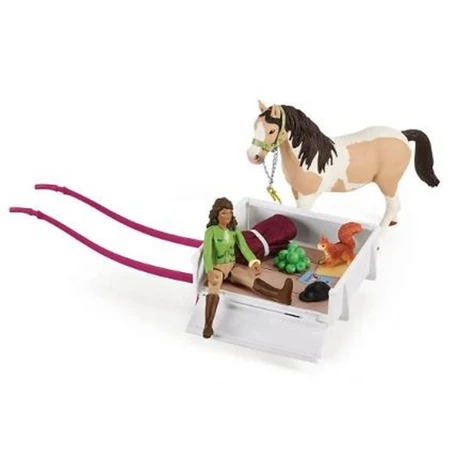 - Content: 1x trailer, 1x tent, 1x toy horse, 1x HC flag, 1x sleeping bag for Sarah, 1x waist strap, 1x Pinto mare, 1x Sarah, 1x squirrel, 1x helmet, 1x green apple, 1x stable halter