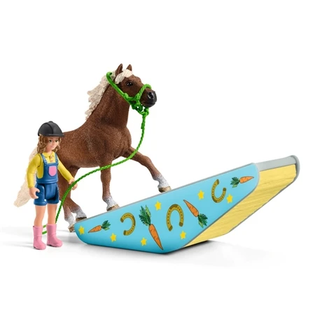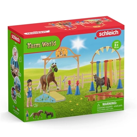 The Schleich Pony Agility Training set contains lots of play opportunities for little equestrians! The set contains: 1 Classic pony, 1 Shetland pony, 1 girl, 1 riding helmet, 1 bridle, 1 lead rope, 1 entrance gate, 8 paddocks, 1 seesaw, 4 cones, 4 tree trunk obstacles, 2 poles, 2 balloons, 1 base plate, 1 archway, 4 pennants, 1 crossbar, 5 flutter curtains, and 1 sticker sheet. Executed to the high standard expected from the Schleich range, the elements can be combined and arranged in any number of ways. The girl has moveable arms and legs, and the seesaw can be turned upside down to form a bridge. The set is also suitable for use with all horses and ponies from the Schleich range.