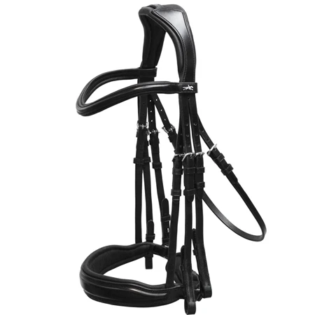 The Schockemohle Milan Anatomical Double Bridle has an anatomically shaped noseband and a unique neck piece. The Milan has been specifically adapted to the horses anatomy and allows unconfined movement of the ears. Due to the reduction of pressure in sensitive areas around cheekbone and neck, the comfort of the horse is considerably enhanced. The Milan is equipped with two browbands, one simple leather browband and one with slim crystal chain.